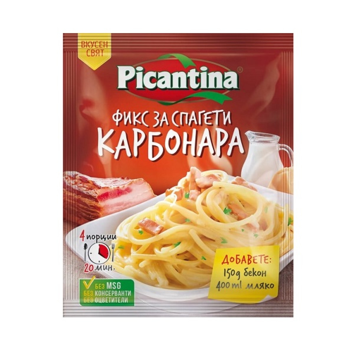 Състав: Сушени зеленчуци 39,26 % (домати на прах и парчета, лук прах и парчета, чесън прах), пшенично брашно*, нишесте (картофено, оризово), подправки 10,56 % (червен пипер, риган, босилек), йодирана сол,захар, зехтин на прах (лактоза**, аскорбил палмитат), смес песто (босилек, чесън, сол, оризово брашно, захар, сирене пекорино***, слънчогледово олио, дрождиев екстракт, силициев диоксид (екстракт от мая, аромати). *съдържа глутен *съдържа лактоза и млечен протеин.